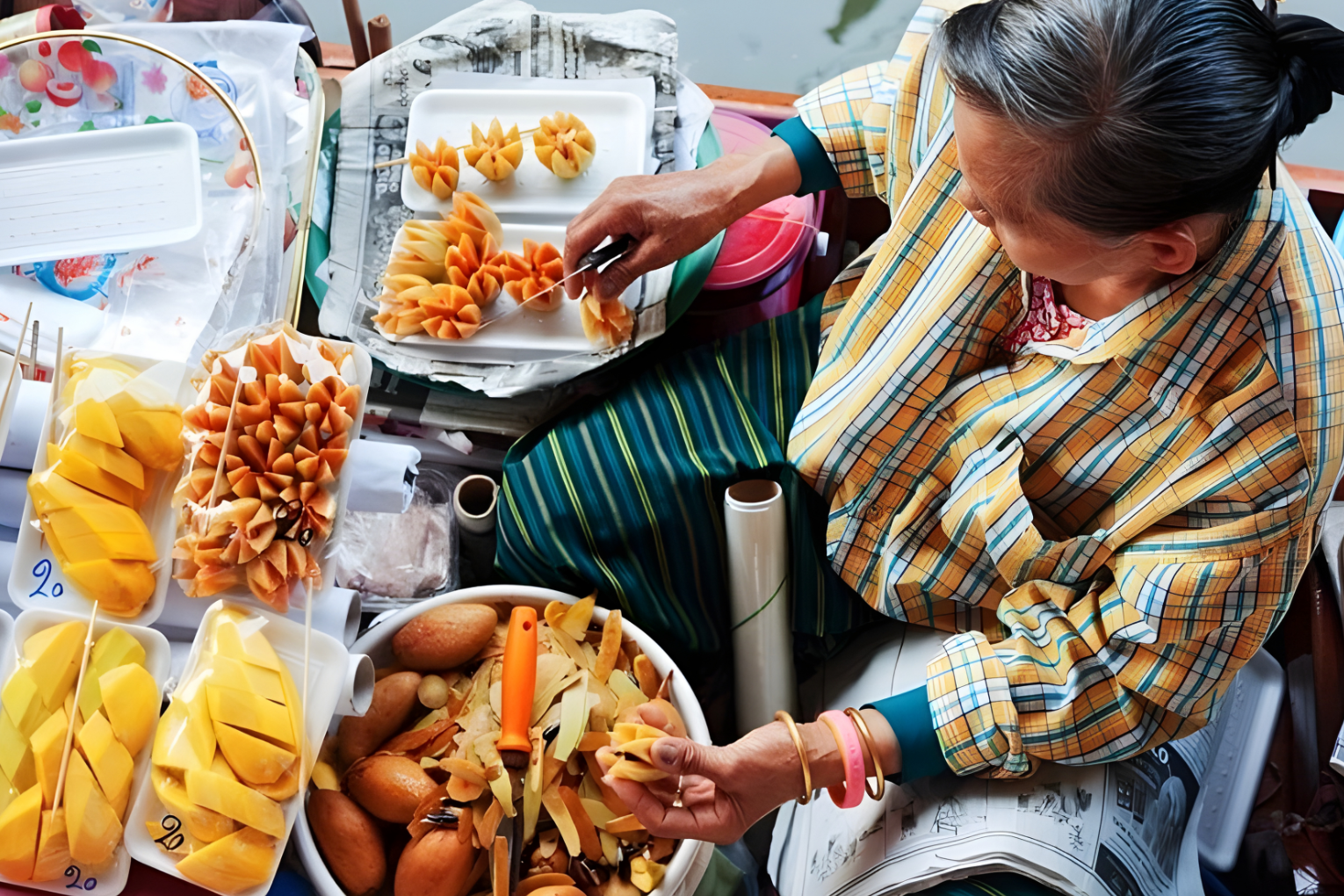 You can try local favorites like pad thai, warm coconut pancakes, boat noodles, and the classic mango sticky rice. Fresh tropical fruits are everywhere, and the smell of freshly cooked food fills the air.
