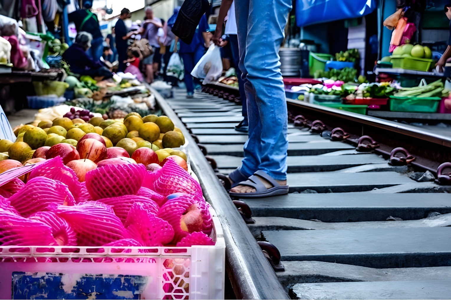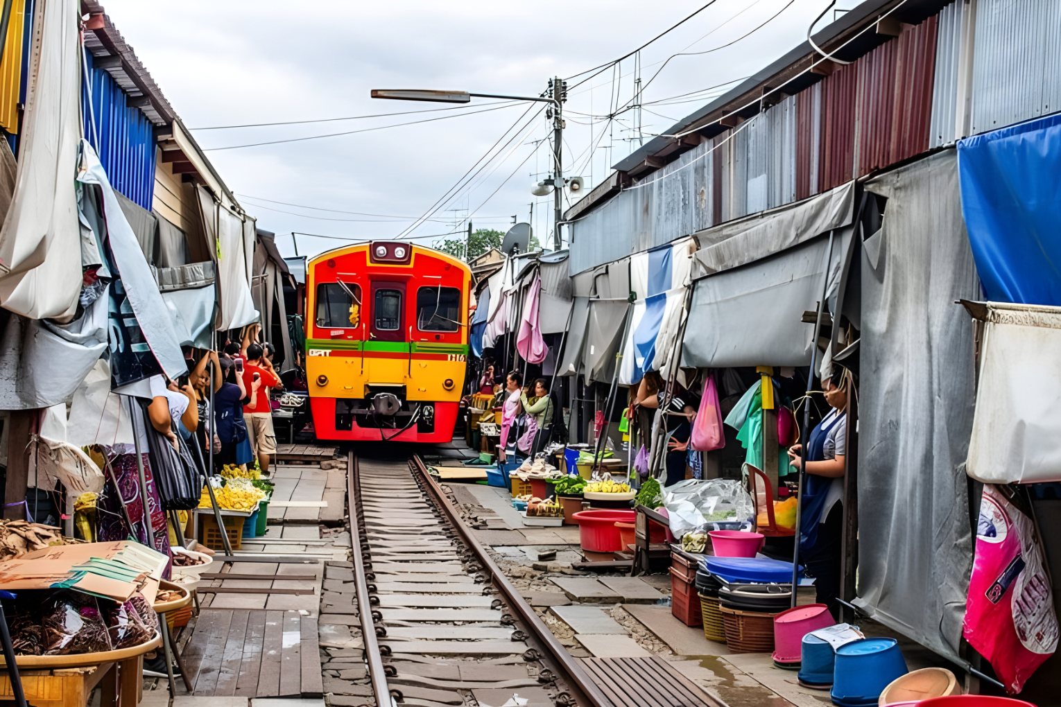 Several times a day, a train moves through the market. As it approaches, vendors quickly pull back their umbrellas and goods. Within moments, the train passes through, and everything returns to normal as if nothing happened.